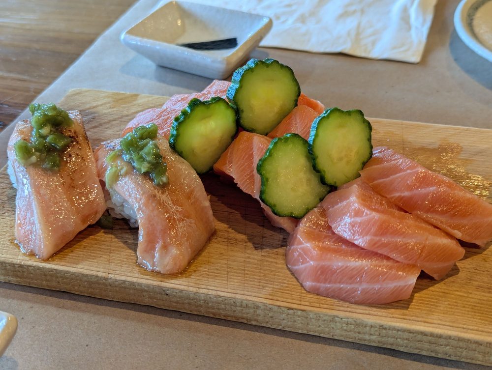 Yellowtail sashimi rolled with rice, topped with fresh jalapeo slices and cucumber.
